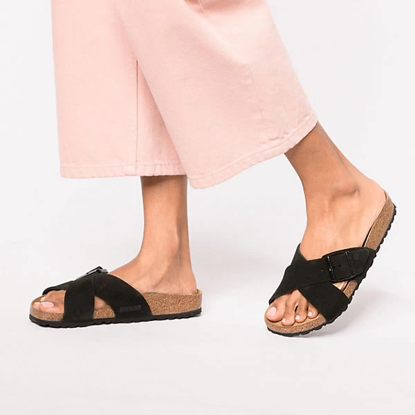 Die schwarze Birkenstock Pantolette Modell Siena überzeugt mit einem herrlich soften Velourleder-Upper und erstklassigem Tragekomfort. Das für Birkenstock typische Kork-Latex-Fußbett mit seinen anatomischen Ausformungen unterstützt und entlastet den Fuß haltgebend. Gelenke und Rücken werden geschont. Gleichzeitig trainiert es die Beinmuskulatur, was Ihre Gesundheit unterstützt und Ihr Wohlbefinden steigert. Das besondere Komfort-PLUS wird durch die Weichbettung erzeugt. Das Fußbett hat eine zusätzliche Schaumeinlage und eine zweite saugfähige Juteschicht, was die Feuchtigkeitsregulierung, Flexibilität und Langlebigkeit der Weichbettung fördert.