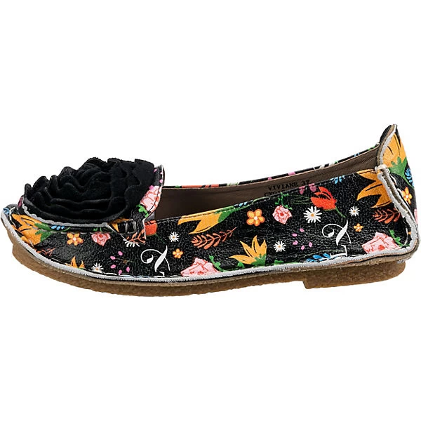 Mit einem glatten Echtleder-Obermaterial und einer verspielten Echtleder-Blumen-Applikation auf der Vorderkappe zeigen sich diese klassischen Ballerinas Viviane von Laura Vita. Die flexible Profil-Laufsohle bietet die nötige Trittsicherheit und zeigt sich mit einer originell gestalteten Sohlenkante.